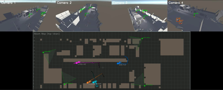 The video below shows the system in action. On the top, you can see the four camera views with detected people highlighted. On the bottom, the room map displays each person’s tracked position in real time as colored dots with motion trails.