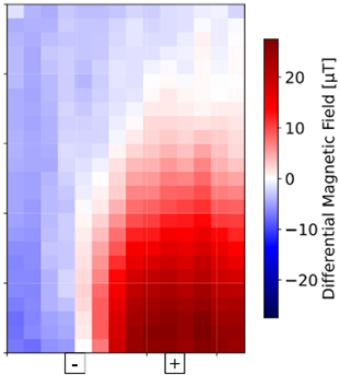 enabling the detection of weak magnetic fields. In preliminary experiments, it was used to study the current distribution within Li-ion battery cells. The experimental setup (Figure 1) employed a motorized stage to generate a complete map of the magnetic field. To ensure measurement accuracy, the sensor head was placed inside a zero-Gauss chamber to shield it from external magnetic fields, including the earth’s field and nearby laboratory equipment.
